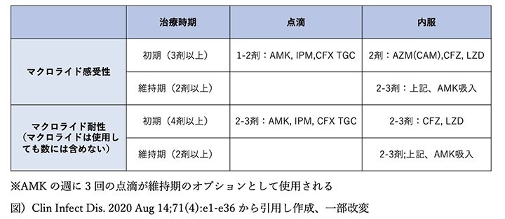 従来より、クラリスロマイシン(CAM)、リファンピシン(RFP)、エタンブトール(EB)の3剤で治療されてきました。